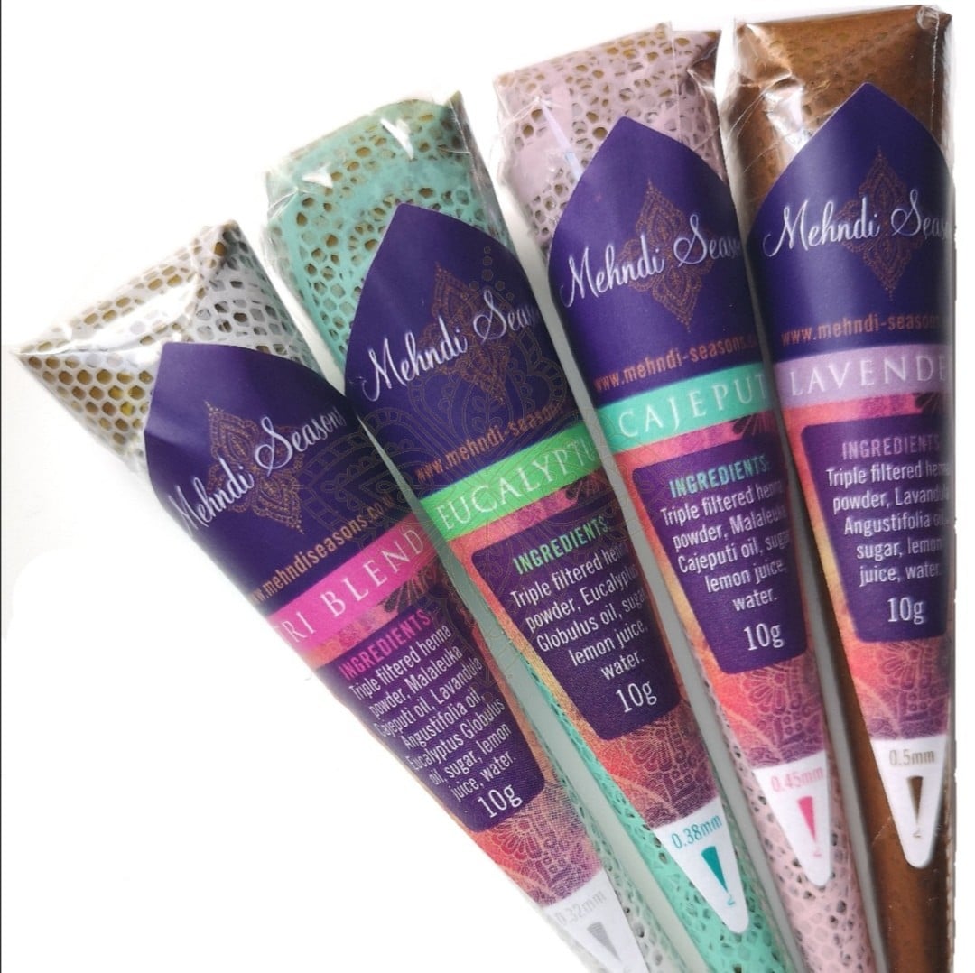 Mehndi Seasons henna cones are hand made using the highest quality natural ingredients to ensure you get amazing henna stain results. The super smooth, creamy and stringy henna paste is made using Mehndi Seasons 100% pure & natural triple filtered Rajasthani henna powder (most recent crop), pure essential oils (aromatherapy quality), demerara sugar & lemon juice.